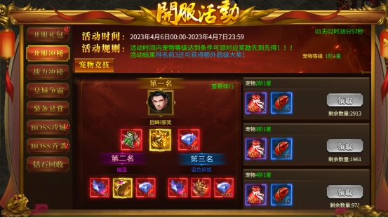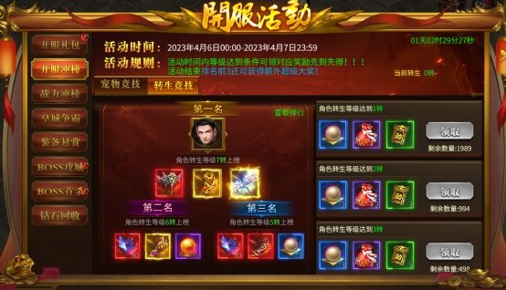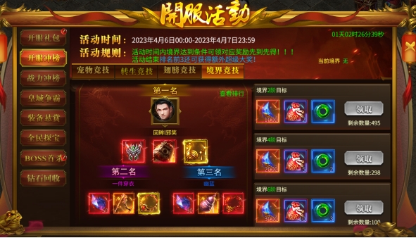 活动内容:开服前5天,每天开启一个冲榜活动,角色满足指定条件即可领取超多丰厚奖励